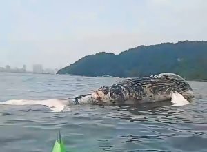 A carcaça do animal estava boiando nas águas próximas à Ilha das Palmas