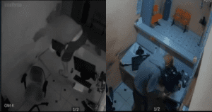 O suspeito pulou, quebrou o balcão e levou celular e televisão da loja