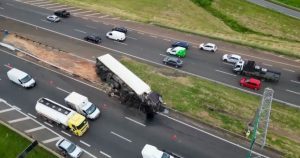 Um caminhão tombou e bateu na proteção metálica da Rodovia Dom Pedro I, em Campinas, nesta manhã. Apesar da imagem impressionante, o...